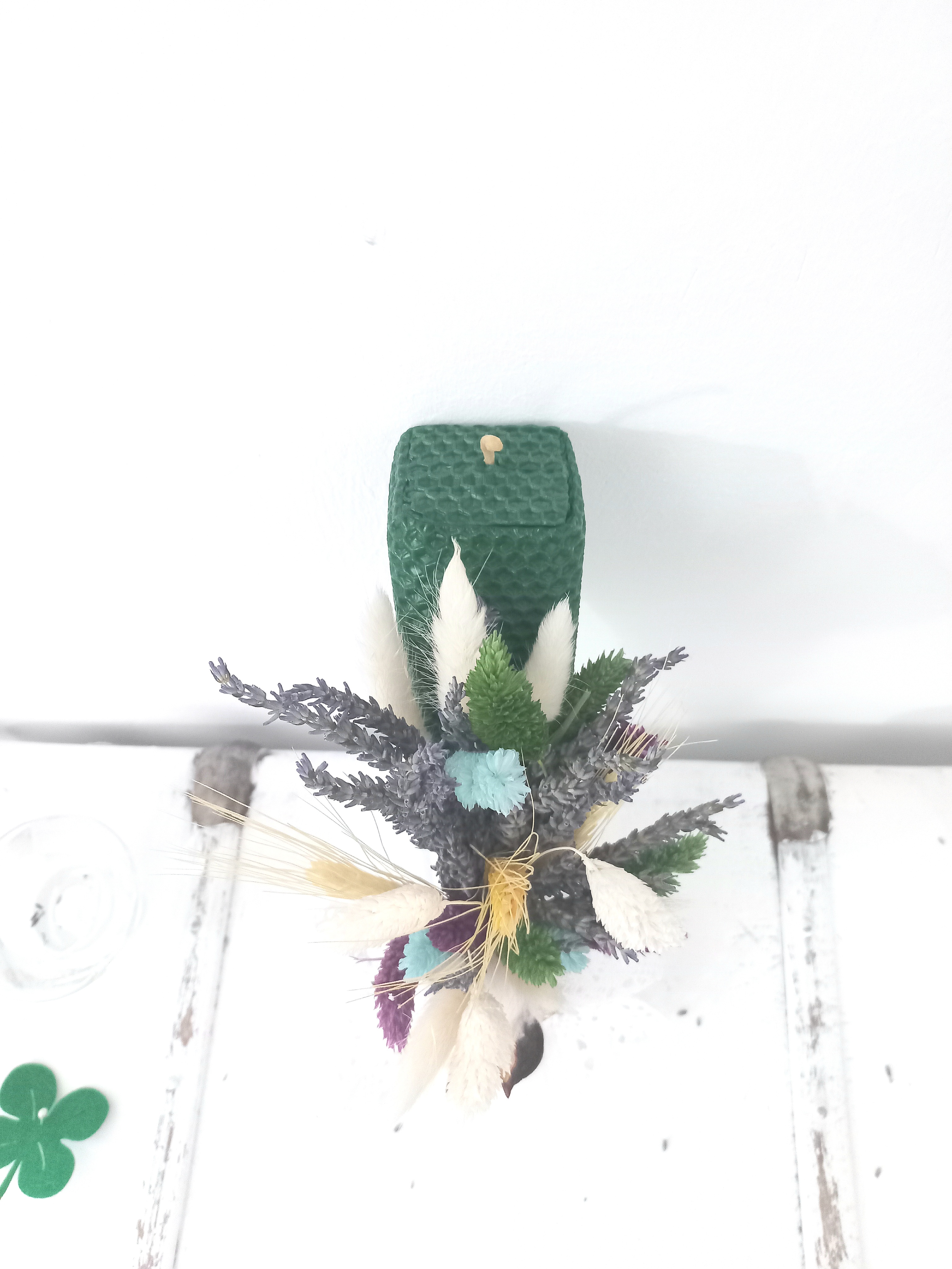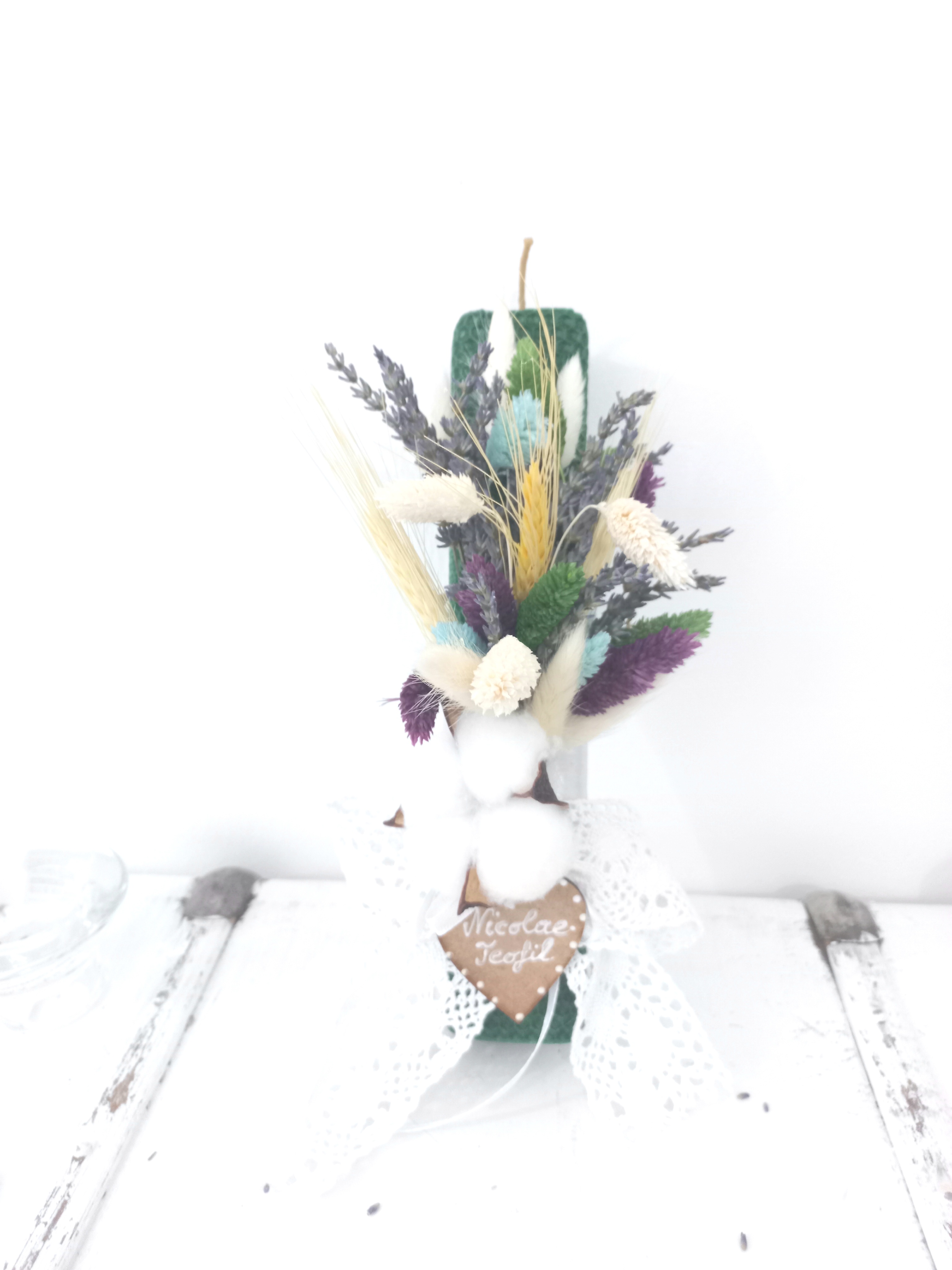 Lumanare scurta din fagure ceara de albine verde,decorata cu flori uscate, bumbac si dantela bumbac.Inimioara de lemn, va fi personalizata cu numele bebelusului.