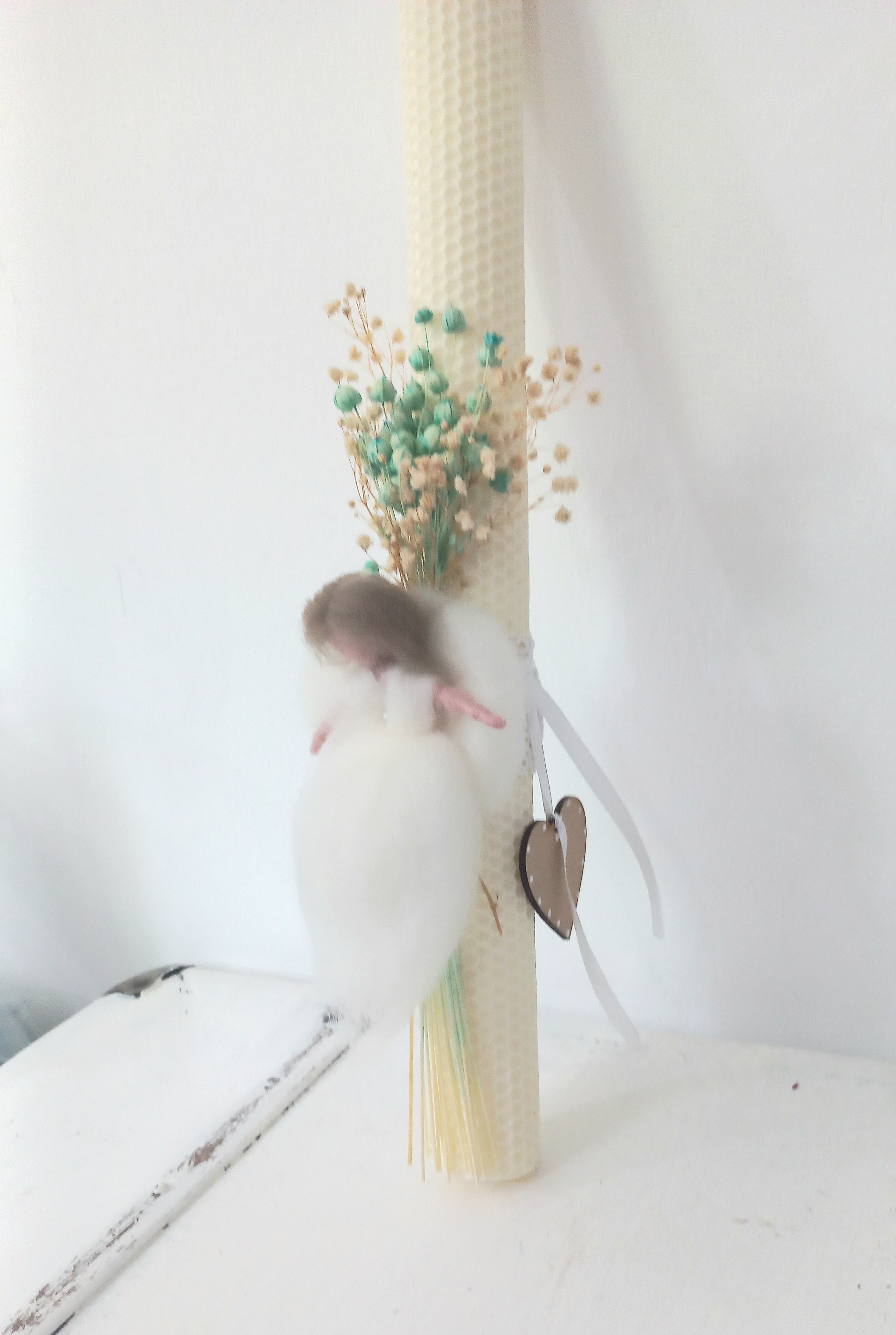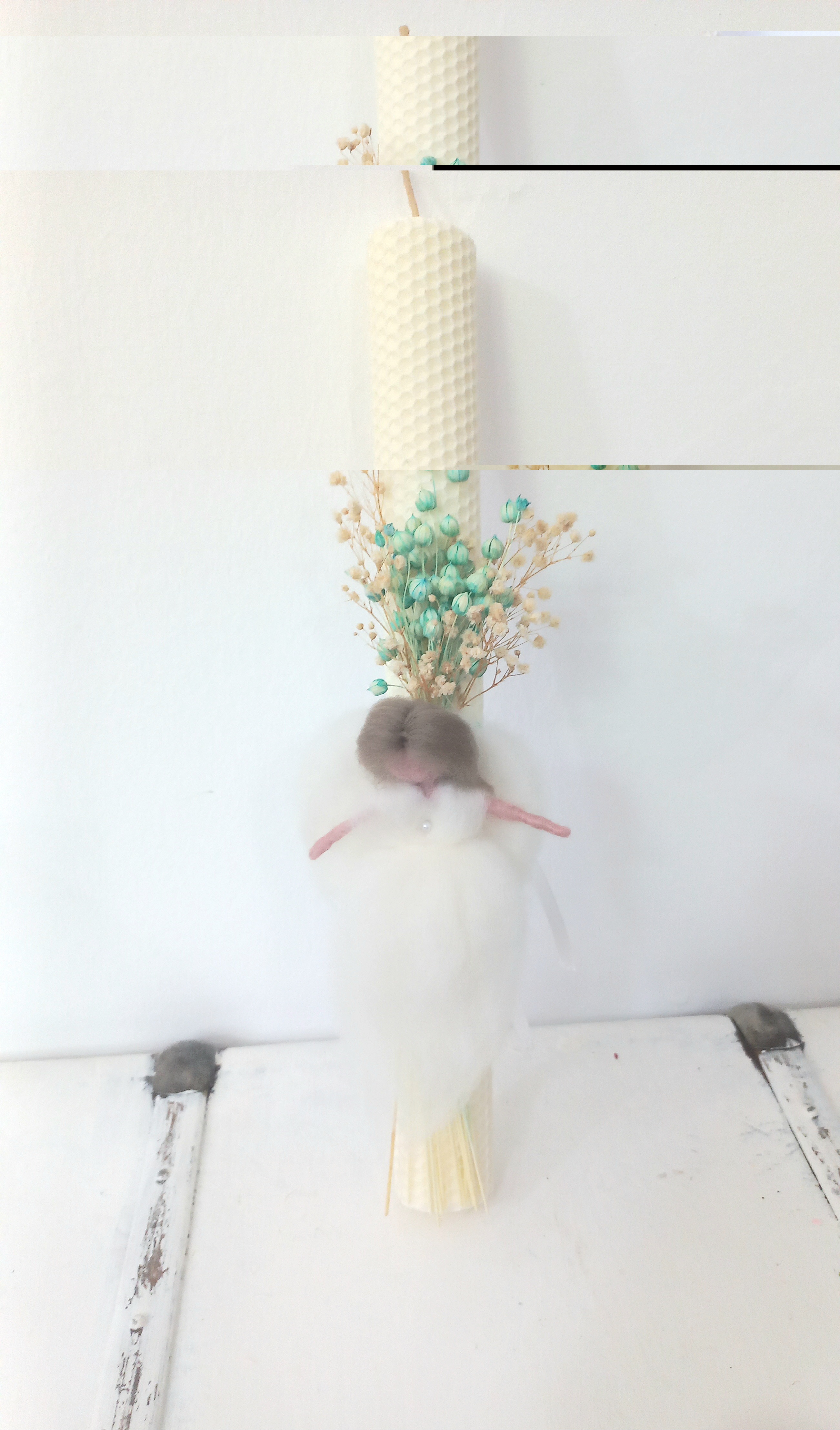 Lumanare din fagure de ceara de albine 41×4 cm, alb ivoire, decorata cu un ingeras din lana impaslita  si flori uscate . Imbinand traditia ortodoxa ce recomanda lumanarea din ceara de albine in biserica, cu ritualurile menite sa aduca noroc si sanatate noului nascut, s-a nascut o noua lumanare de botez .