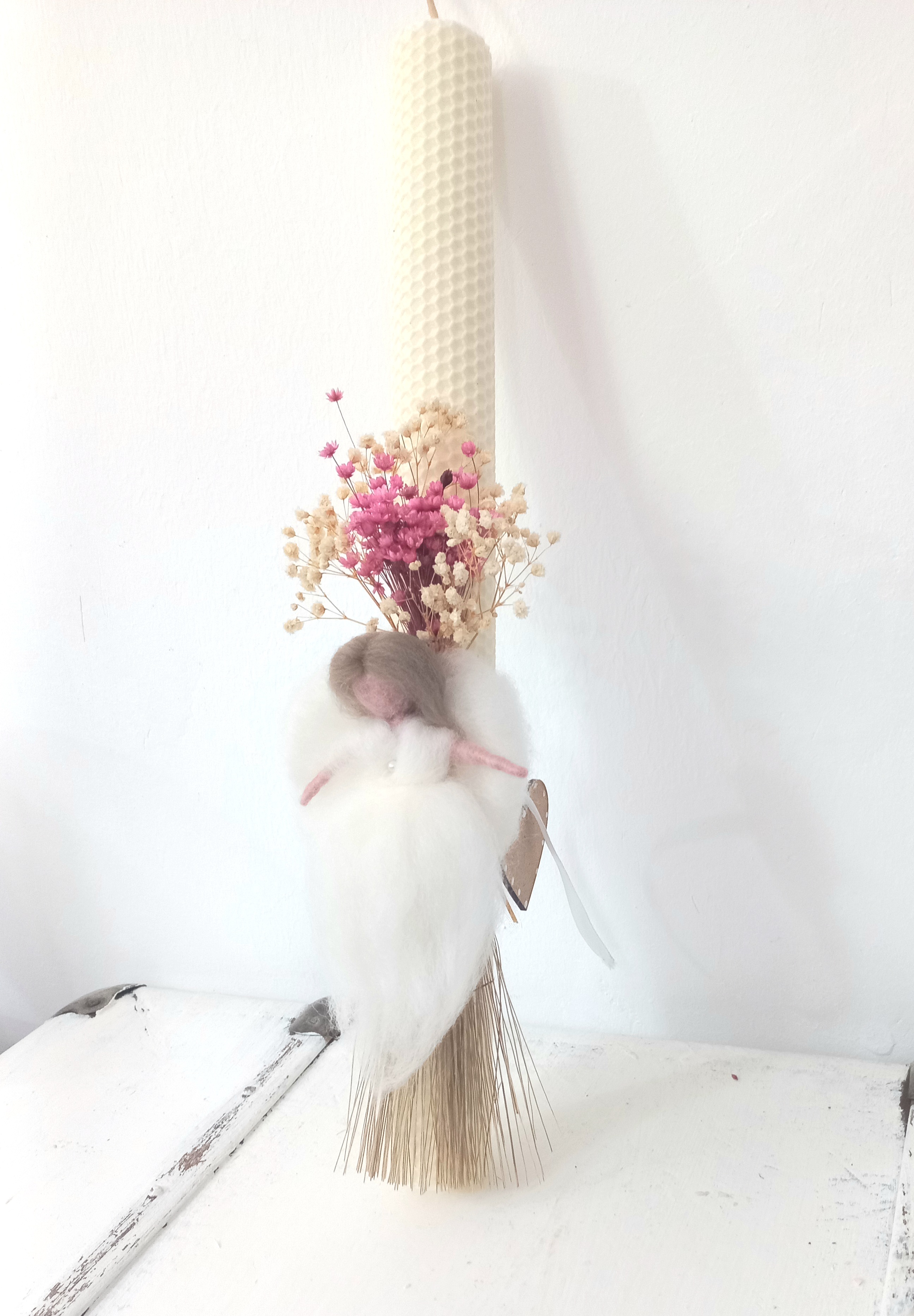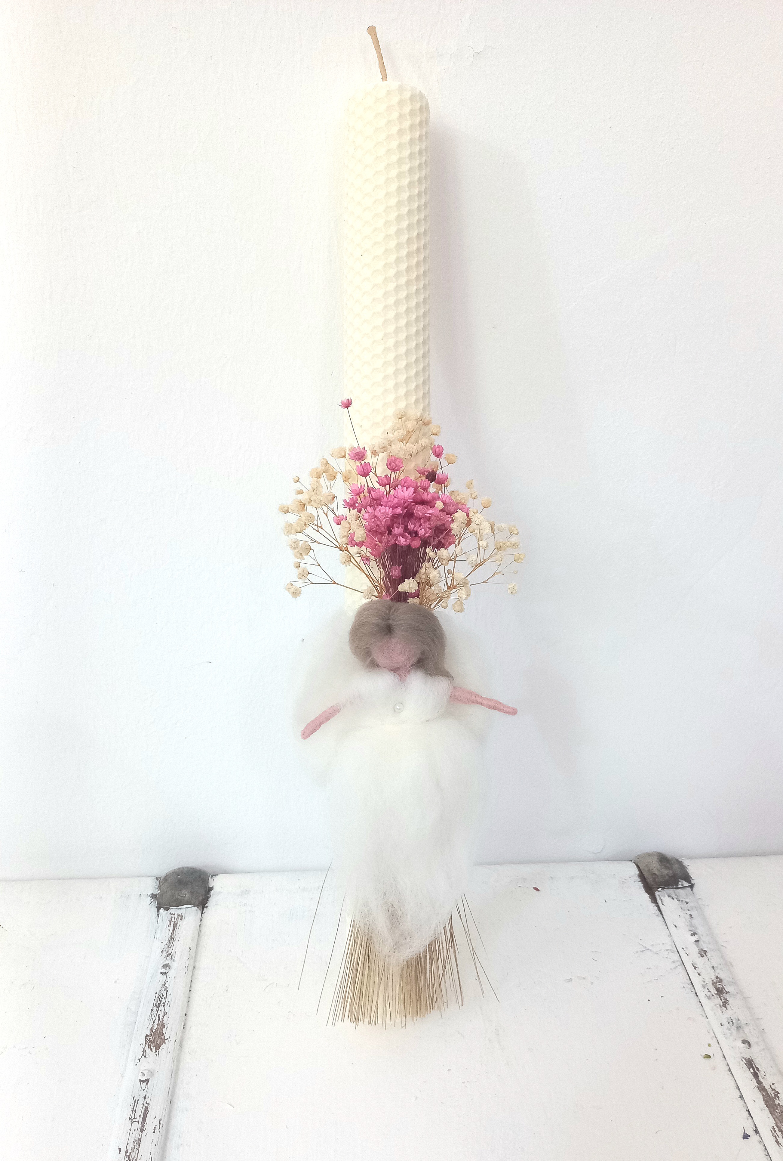 Lumanare din fagure de ceara de albine 41×4 cm, alb ivoire, decorata cu un ingeras din lana impaslita si flori uscate . Imbinand traditia ortodoxa ce recomanda lumanarea din ceara de albine in biserica, cu ritualurile menite sa aduca noroc si sanatate noului nascut, s-a nascut o noua lumanare de botez .