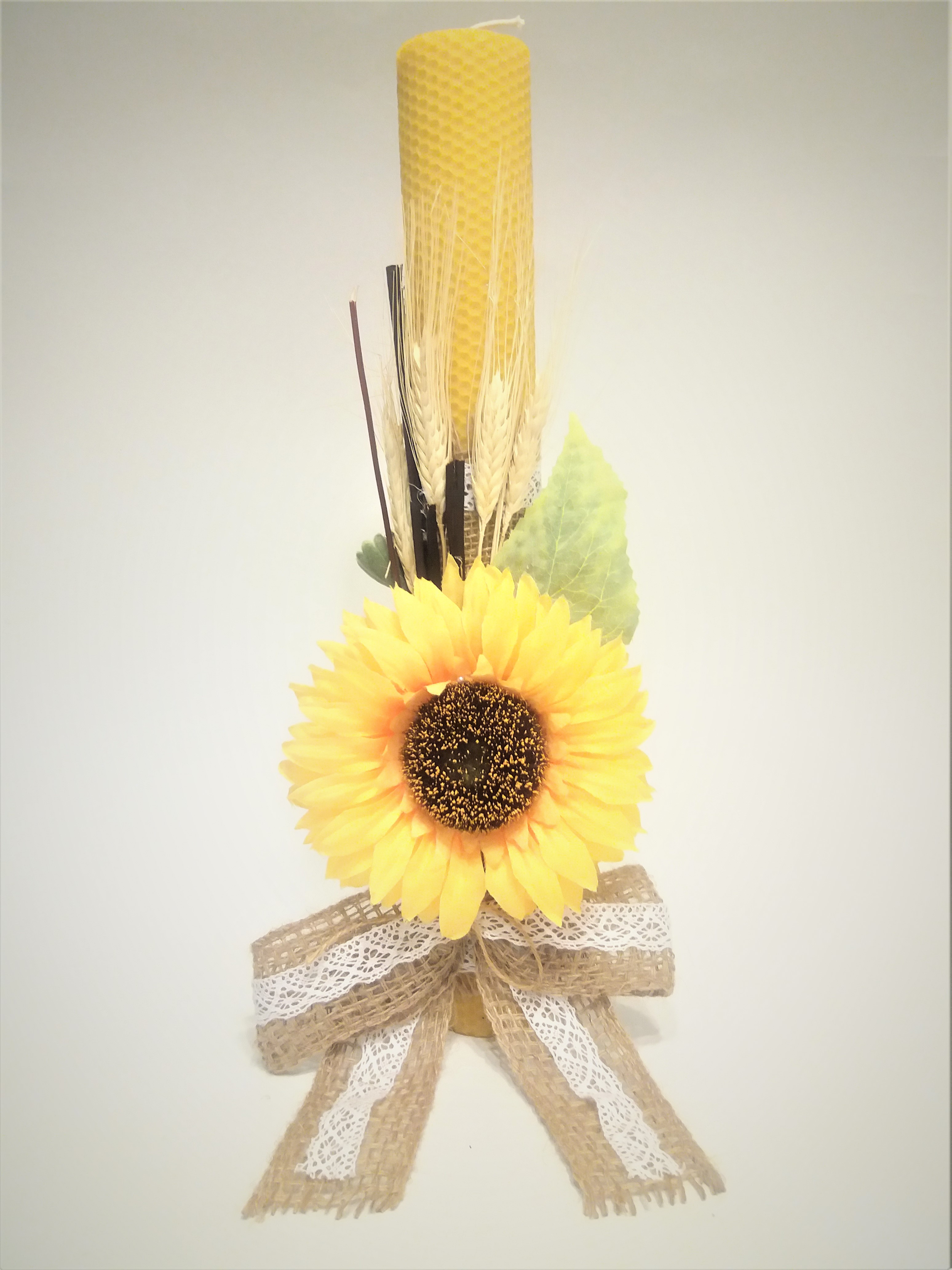 Lumanare nunta/botez din fagure ceara de albine rulat, decorata cu iuta, grau si floarea soarelui din material textil, pentru o nunta/un botez traditional romanesc! Inimioara de lemn pictata va fi personalizata cu numele mirilor/ bebelusului. Dimensiunea din imagine 41x 5 cm. La cerere se pot confectiona si alte dimensiuni.Pretul este pentru o bucata